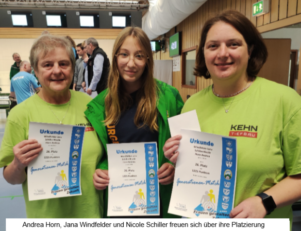 Die 1. Mannschaft (Andrea Horn, Jana Windfelder und Nicole Schiller; im Bild von links) erreichte 1.225 Punkte und punktgleich mit der Mannschaft von Freischütz Zeitlarn Platz 26. Nicole Schiller trat für ihr Team zum Ausscheidungsschießen an. Beim 1. Durchgang hatten beide Schützen wieder die gleiche Punktzahl. Den 2. Durchgang konnte die Burgebracherin mit 67 zu 66 Punkten für ihre Mannschaft gewinnen. Bei der Siegerehrung wurden den drei Schützinnen Urkunden und ein Geldpreis überreicht. Die weiteren Wertungen: Michael Beck, Oliver Lechner, Georg Pflaum (29., 1.221); Claudia, Jenny und Katharina Nitschke (43., 1.195); Georg Düll, Bernadette Lechner, Paul Schiller (50., 1.186); Emil, Lothar und Michael Horn (55., 1.174); Marianne Selig, Markus und Sofia Volk (60., 1.135); Jan und Tobias Nitschke, Marika Pflaum (63., 1.116). Nach der Siegerehrung kehrten die Schützinnen und Schützen mit ihren Familienangehörigen auf dem Heimweg in Ingolstadt zum Abendessen ein.