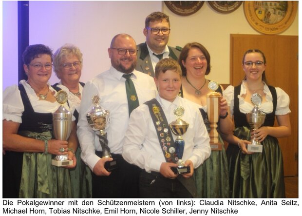 Die Schützenmeister Anita Seitz und Tobias Nitschke verteilten die Pokale und Sachpreise. Bei der Meisterserie konnten sich folgende Schützen platzieren: Schützenklasse: 1. Michael Horn (102,4 Ringe), 2. Oliver Lechner (101,2), 3. Tobias Nitschke (89,2), 4. Daniel Schmidt (86,7), 5. Marcus Seitz (79,7); Damen: 1. Nicole Schiller (100,4), 2. Tamara Fischer (100,0), 3. Melanie Horn (97,2), 4. Katharina Nitschke (97,0), 5. Nina Kehn (79,0); Senioren: 1. Lothar Horn (106,3), 2. Marianne Selig (104,7), 3. Georg Düll (103,9), 4. Claudia Nitschke (103,0), 5. Georg Pflaum (102,6); Jugend: 1. Jenny Nitschke (96,0), 2. Laura Seitz (95,6), 3. Max Gille (94,6), 4. Jana Windfelder (93,9), 5. Anna Stark (88,8); Schüler: 1. Paul Schiller (88,9), 2. Emil Horn (85,4), 3. Jakob Morgenroth (79,7), 4. Anton Schiller (79,5), 5. Vincent Obexer (41,3). Die Ehrenscheibe der Schützenklasse gewann Hannes Schrüffer mit einem 72,6 Teiler vor Oliver Lechner (79,6) und Tamara Fischer (110,3).