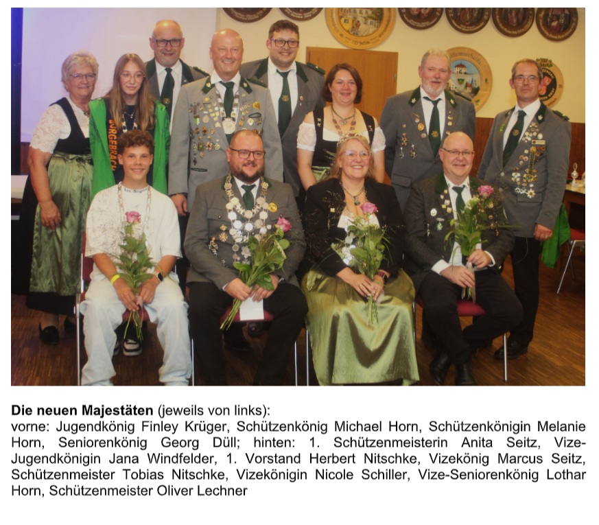 Höhepunkt des Abends war die Proklamation der neuen Majestäten. Der 1. Vorstand Herbert Nitschke kürte als Jugendkönig Finley Krieger (86,8 Teiler). Vize-Jugendkönigin ist Jana Windfelder (153,2) vor Jenny Nitschke (188,6). Bei den Senioren kamen in diesem Jahr die Herren zum Zug. Herbert Nitschke konnte den Königspokal Georg Düll (108,2 Teiler) überreichen, der diesen Titel vor Lothar Horn (159,2) und Andrea Horn (251,5) errang. Die Vorstände der beiden Patenvereine, Robert Schrüffer und Roland Volk, proklamierten als Schützenkönigin Melanie Horn, die mit einem 140,9 Teiler Nicole Schiller (184,9) und Tamara Fischer (224,7) besiegte. Die Würde des Schützenkönigs errang Michael Horn mit einem 137,7 Teiler. Sein Vize ist Marcus Seitz mit einem 538,6 Teiler vor Tobias Nitschke (554,5).